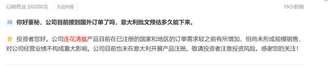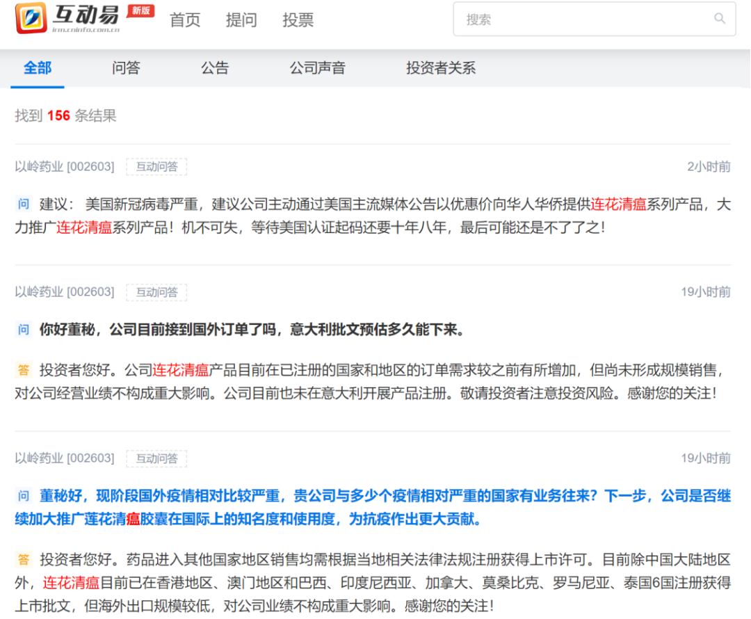 在深交所互动易平台上,以岭药业生产的连花清瘟胶囊情况以及海外市场注册上市的进展,也受到了投资者的热度关注。近一月以来,相关话题的问询已经达到150多条。