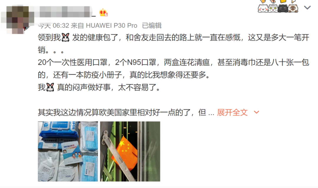 一位在法国的留学生也晒出了自己领到的“健康包”物品清单:20个一次性医用口罩,2个N95口罩,两盒连花清瘟,甚至消毒巾还是八十张一包的,还有一本防疫小册子。