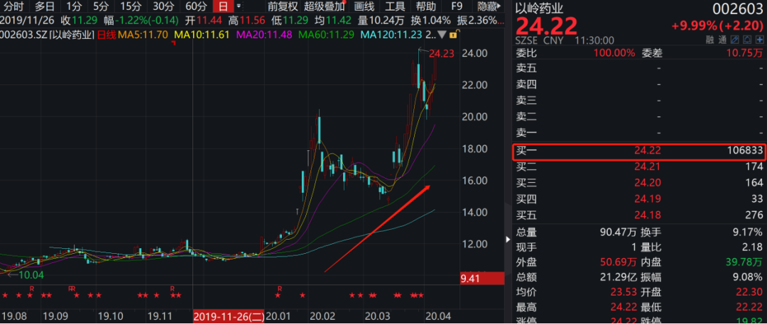 4月8日上午,上市公司以岭药业在早盘开盘一个小时后,股价快速封上涨停。截至午盘收盘,仍有超10万手买单封在涨停板上。数据显示,今年以岭药业股价已经涨超90%以上,市值飙升超140亿。