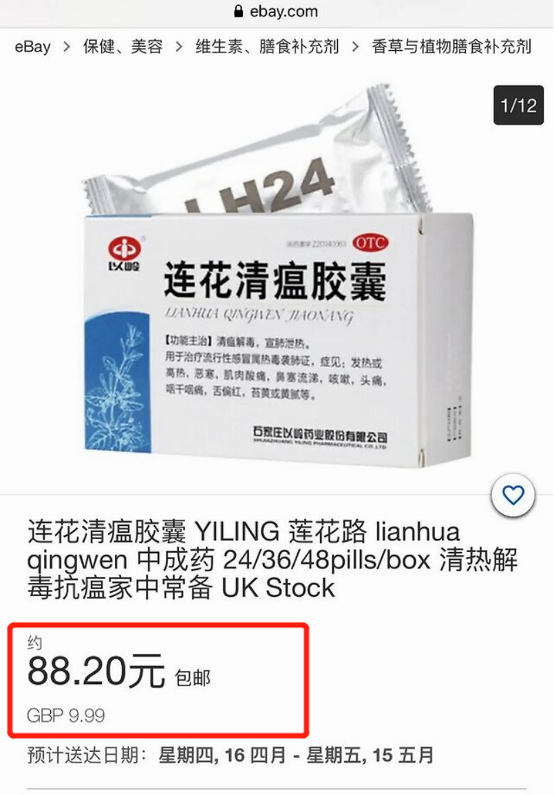 从线下药店和国内平台上查询了解,目前在售的24粒装连花清瘟胶囊零售价每盒最低15元左右,而在跨境电商ebay平台,这款价格竟然已达到88.2元/盒。相比国内售价,连花清瘟胶囊的身价暴涨了近6倍。