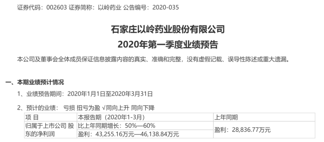 除了股价之外,以岭药业的业绩也获得了实质性的抬升。3月30日晚间公告显示,以岭药业预计2020年一季度净利润为4.33亿元4.61亿元,同比增长50%至60%,两项指标均创下上市以来最高峰。以岭药业一季度业绩,实际就相当于其2019年上半年实现的4.55亿元净利润。
