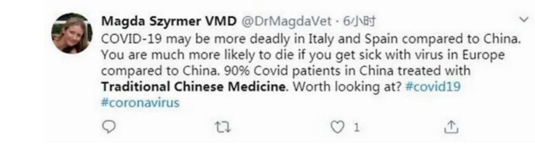 美国网友Magda Szyrmer VMD说:与中国相比,意大利、西班牙等国的新冠肺炎患者死亡率可能更高。中国90%的新冠肺炎患者都接受了中医药治疗。是不是值得了解一下呢?
