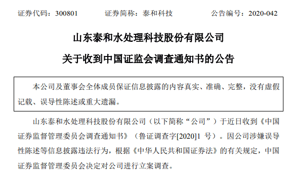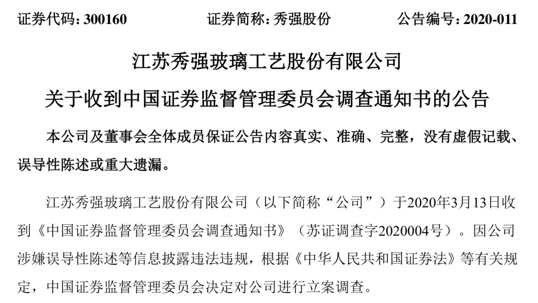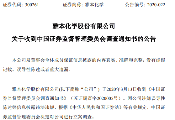 在今年的“3·15”消费者权益日,证监会重拳“打假”,秀强股份、泰和科技、雅本化学同于3月15日晚间披露,三公司于近日分别收到《中国证监会调查通知书》,因涉嫌误导性陈述等信息披露违法违规,根据《中华人民共和国证券法》等有关规定,中国证监会决定对三家公司进行立案调查。