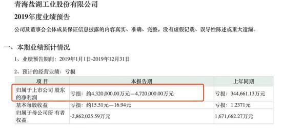 大幅折价处置不良资产后,*ST盐湖也将因巨额资产减值损失而亏损。公司发布业绩预告称,预计2019年公司亏损约432亿元~472亿元,2018年同期亏损34.4亿元。432亿元是什么概念?要知道,截至1月10日收盘,*ST盐湖的总市值为239亿元。而公司注册地址所在的青海省格尔木市,2018年的GDP才368亿元!