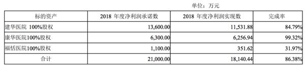 2016年2月5日,康瀚投资承诺建华医院2016年度、2017年度、2018年度实现扣非归母净利润分别不低于1.05亿元、1.23亿元和 1.36亿元。结果,建华医院2017年、2018年均未能实现承诺利润。据每日经济新闻消息,2019年初审计过程中,康瀚投资对立信会计事务所审计结果不认可,建华医院一方对外称,当时的建华医院院长梁喜才被迫在审计报告上签字。