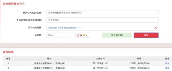 查阅中国执行信息公开网发现,康瀚投资在今年7月份有两次被执行信息,且均是被齐齐哈尔市中级人民法院于同一天执行。