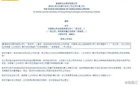 12月18日,港交所发布公告称,将从12月23日上午9时起,对辉山乳业的上市地位予以取消。