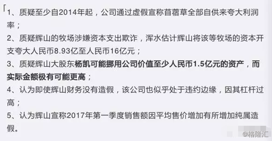 2016年12月16日,浑水发布沽空报告,直指辉山乳业财务造假,认为辉山乳业至少从2014年开始发布虚假财务报表,夸大其资产价值及负债。此外,公司董事会主席兼首席执行官杨凯挪用公司资产1.5亿港元,甚至更多,因此公司估值实际接近零。