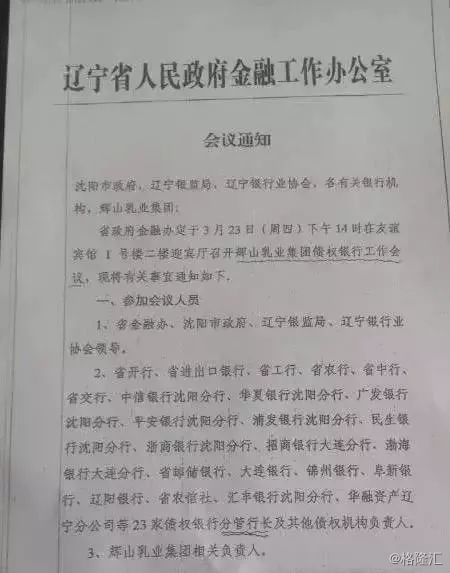 2017年3月23日,辽宁省金融办紧急召开辉山乳业集团债权银行工作维护会议,23家债权行(包括工农中交等)与辉山乳业集团相关负责人均出席,会议上,杨凯承认公司资金链断裂。