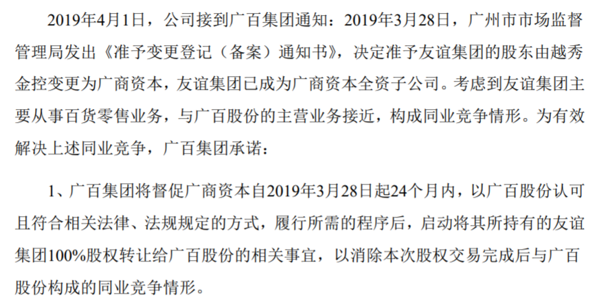 一年前公司对该起重组就有过预告。2019年4月,广百股份披露收到广百集团通知,将督促广商资本将其持有的友谊集团100%股权转让给广百股份,时间期限为2年。