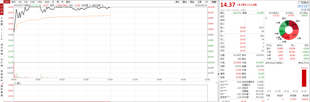 随后,广百股份迅速走高,不到十点就已封在涨停板,此后虽然频频开板、封板,再开板,再封板,但截至中午收盘,公司股价依然为14.37元/股,涨幅为9.78%。