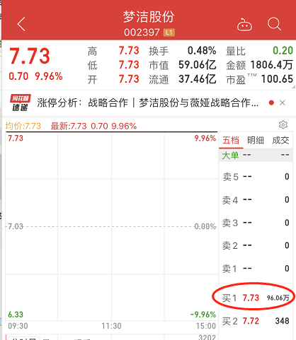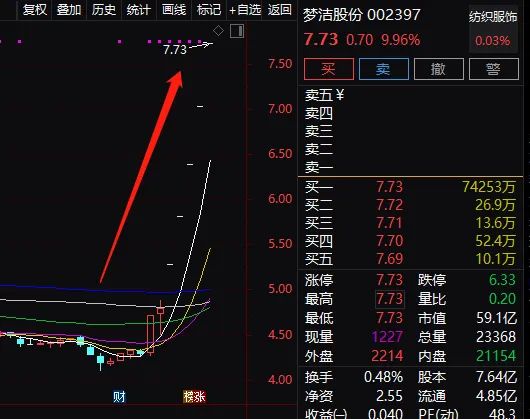 搭上淘宝第一网红女主播薇娅,梦洁股份股价今日继续一字涨停,蹭蹭蹭已经5个一字涨停板,股价由4.8元狂涨至今日收盘7.73元,5个交易日股价暴涨61%,市值暴增22.39亿元。
