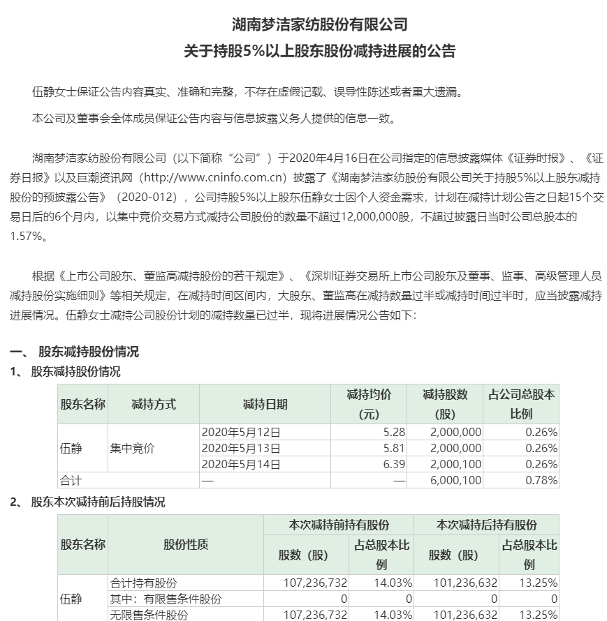 梦洁股份今年 4 月 16 日公告,公司持股 5%以上股东伍静女士因个人资金需求,计划在减持计划公告之日起 15 个交易日后的 6 个月内,以集中竞价交易方式减持公司股份的数量不超过1200万股,不超过公司总股本的 1.57%。