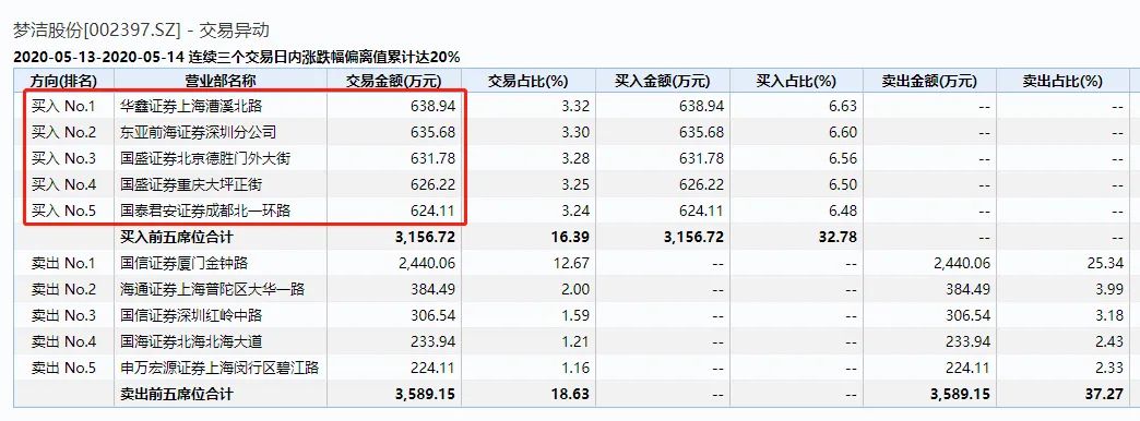 不论是5月8日-5月12日,还是5月13日-5月14日的龙虎榜席位上,梦洁股份的龙虎榜前五大买入席位均为券商营业部的游资席位,其中5月8日-5月12日期间前两大卖出席位还是机构席位。