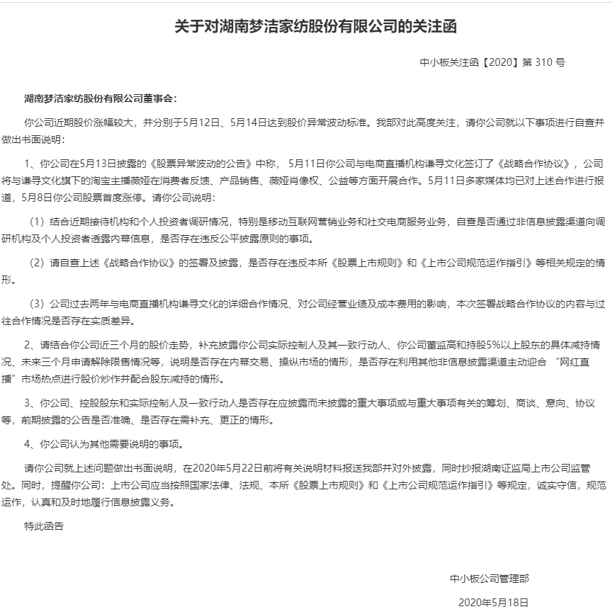 对于梦洁股份的股价异动,深交所今天发布关注函,要求说明是否存在主动迎合 “网红直播”市场热点进行股价炒作并配合股东减持。