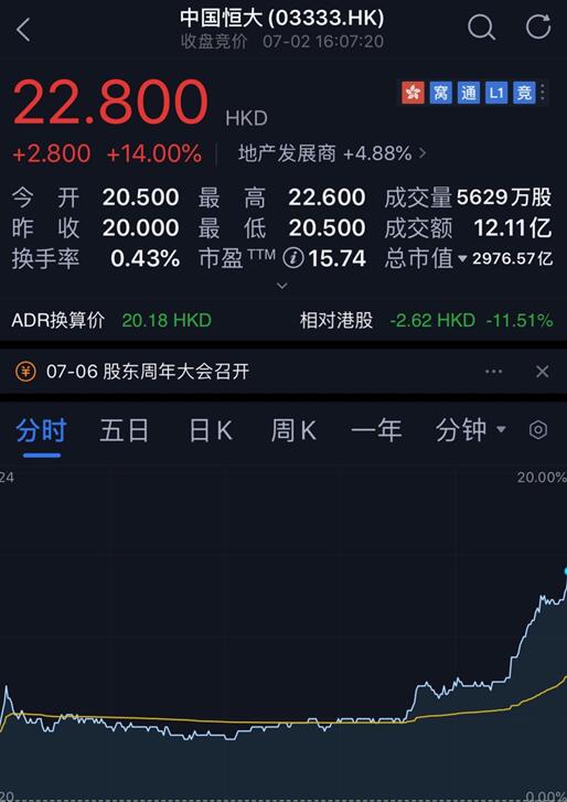 在公布超预期的半年销售业绩后,7月2日港股开盘后中国恒大(3333.HK)股价持续走高,截至收盘大涨14%,收报于22.8港元。自3月末以来,恒大股价累计涨幅已超130%,在地产股中一枝独秀。