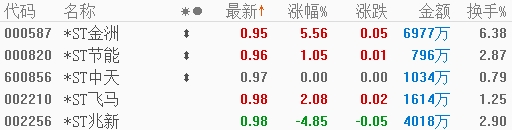*ST金洲近期出现过连续15个交易日股价不足1元,上周四股价回到1元,但最近又是3天股价不足1元;*ST飞马已连续6个交易日不足1元;*ST中天连续4个交易日不足1元。