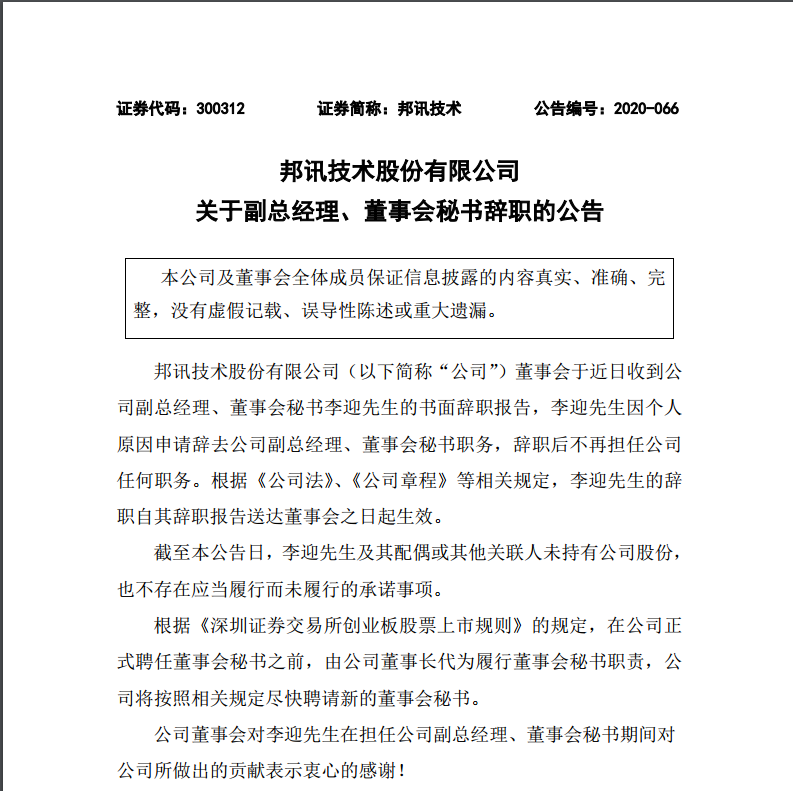 同时,邦讯技术16日晚间还公告称,公司董事会于近日收到副总经理、董事会秘书李迎的书面辞职报告,李迎因个人原因申请辞去公司副总经理、董事会秘书职务,辞职后不再担任公司任何职务。根据《公司法》、《公司章程》等相关规定,李迎的辞职自其辞职报告送达董事会之日起生效。