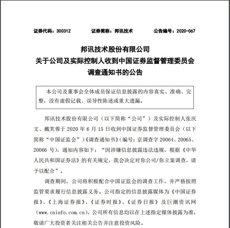 邦讯技术(300312,SZ)16日晚间公告,公司及实际控制人张庆文、戴芙蓉于2020年6月15日收到中国证监会《调查通知书》。因涉嫌信息披露违法违规,根据《中华人民共和国证券法》的有关规定,证监会决定对公司及实际控制人张庆文、戴芙蓉立案调查。