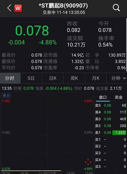 11月13日收盘,*ST鹏起出现A股和B股股票收盘双双跌破面值境况。11月14日开盘,*ST鹏起再度迎来“A+B”同步跌停。截至发稿前,*ST鹏起A股报收0.9元,超11万手卖单封在涨停板上;*ST鹏起B股报收0.078美元。