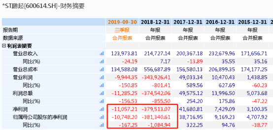 数度跌停背后,正是上市公司巨幅下滑的业绩和糟糕的内部管理情况。数据显示,2018年*ST鹏起的净利润巨亏达到38.1亿元。而今年前三季度,公司亏损持续,归母净利润为-10.75亿元,同比下滑达到167%。