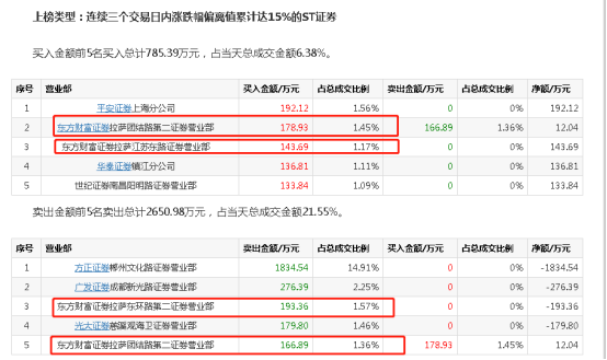 以8月16日*ST鹏起龙虎榜为例,当天有高达1.2亿资金在二级市场交易*ST鹏起股票,其中买入前5的总计金额高达785万元,占当天总成交金额的6.38%。在买卖席位中,出现了东方财富证券拉萨团结路第二证券营业部、东方财富证券拉萨江苏东路证券营业部等知名游资机构的身影。
