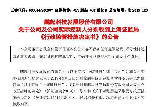 9月18日,*ST鹏起和实控人张朋起收到了上海证监局的《行政监管措施决定书》。上述罚单显示,由于公司对外违规担保累计金额达到15.75亿元,实控人违规占用资金达到7.46亿元以及其他严重违反信息披露的情况,因此对上市公司及张朋起作出责令改正的处罚决定。