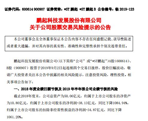 而从*ST鹏起的基本面,并没有发生核心的变化。这也让公司不得不发出公告提示投资者,公司仍然存在业绩亏损、资金占用、经营困难等风险,需要警惕市场炒作。