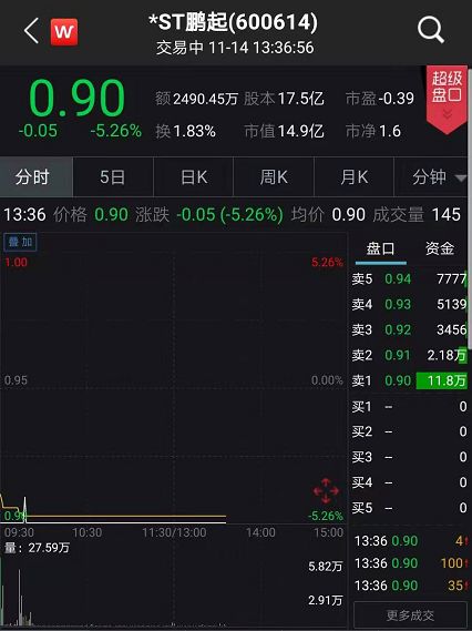 11月14日,*ST鹏起毫无悬念出现跌停。其中*ST鹏起A股午盘报收0.9元,超11万手卖单封在涨停板上;*ST鹏起B股午盘报收0.078美元。