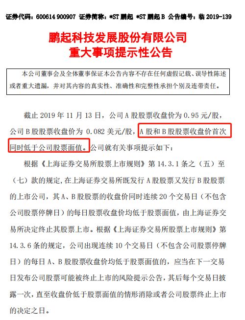 *ST鹏起公告称,截至11月13日,公司A股股票收盘价为0.95元/股,公司B股股票收盘价为0.082美元/股,A股和B股股票收盘价首次同时低于公司股票面值。