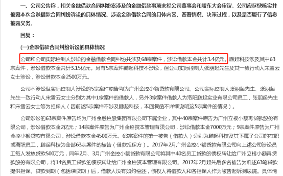 不过,这些努力并没有换来股价的修复。而更糟糕的是,实控人开始以上市公司名义违规对外担保和借款,并进行资金的占用。2018年11月23日,*ST鹏起公告称公司及其实际控制人涉讼的金融借款合同纠纷共涉及68宗案件,涉讼借款本金共计3.4亿元。