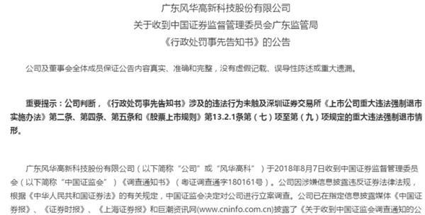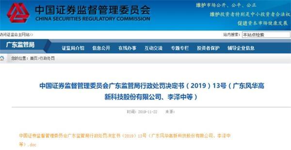 值得注意的是,早在今年8月28日,风华高科就发布公告称,收到中国证监会广东监管局下发的《行政处罚事先告知书》,公司涉嫌信息披露违法违规一案,已调查完毕,依法拟对公司及相关当事人作出行政处罚。根据《行政处罚事先告知书》,监管责令风华高科改正,给予警告,并处以40万元罚款;对公司其余涉案人员也给予相应的处罚。