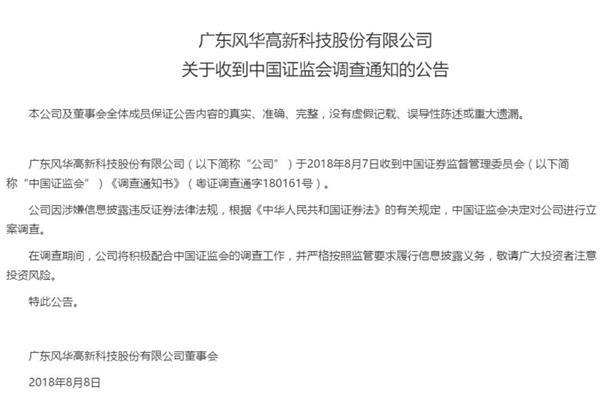 高速的增长背后藏隐忧。2018年8月7日,风华高科公告称收到中国证监会《调查通知书》。公司因涉嫌信息披露违反证券法律法规,根据《中华人民共和国证券法》的有关规定,中国证监会决定对公司进行立案调查。