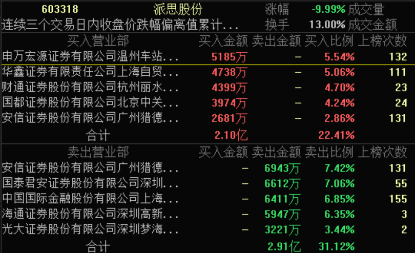 派思股份11月6日的龙虎榜数据显示,卖出前3名营业部分别中山证券深圳梅林路营业部、财富证券揭阳黄岐山大道营业部和中投证券广州体育东路营业部;11月7日的龙虎榜数据显示,卖出前2名营业部分别是财富证券深圳香林路营业部和国信证券上海北京东路营业部;