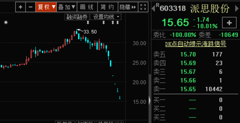 今日,派思股份以16.3元开盘,之后股价快速被打压至跌停板,期间股价也曾几度打开跌停。至e公司记者发稿时止,派思股份的股价依然处于跌停状态。从11月1日至今的7个交易日,该股累计跌幅已经达到46.7%。而如果从该股10月15日创出的高点33.5元算起,派思股份的股价已经被腰斩。
