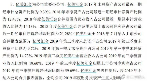 影响有多重大?从亿美汇金前三季度的经营表现就可见一斑。2019年前三季度,亿美汇金营业收入占上市公司当期营业收入比例为19.60%,同期亿美汇金归属上市公司净利润占上市公司的比例为59.69%。
