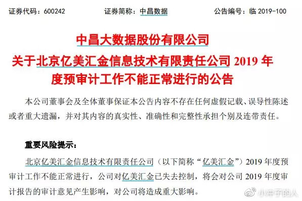 12月5日晚,中昌数据突发公告称,由于孙公司亿美汇金2019年度预审计工作不能正常进行,公司对亿美汇金已失去控制,将会对公司2019年度审计报告的审计意见产生影响,对公司将造成重大影响。