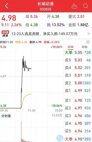 在二级市场上,长城动漫、长城影视今日开盘再度跌停。然而在10:50左右,长城动漫开始惊现大量买单,短短7分钟内,股价由跌停板上冲至涨8%以上,拉升幅度达到18%。长城影视股价也随之异动,在巨量资金蜂拥之下,股价由跌停板上冲至涨4%以上,拉升幅度超过14%。截至午间收盘,长城动漫、长城影视成交额分别达到1.88亿元、1.7亿元。