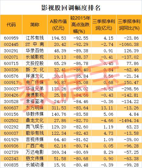 受行业整体业绩下滑及监管趋严影响,在经过2015年的疯狂并购之后,影视类公司股价遭遇大幅度调整。数据宝统计显示,与2015年以来的高点相比,影视类公司股价回调60%以上的占比87%。回调幅度最大的是江苏有线,累计回调92.55%。公司近三年业绩持续下滑,前三季度实现盈利4.15亿元,同比下滑23.86%。回调幅度居前的还有ST中南、华录百纳、长城影视、文投控股、新文化等。