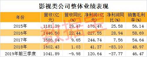 证券时报·数据宝统计显示,自2015年以来,影视行业上市公司整体业绩不断下滑,去年影视类公司合计营收同比增长仅1.03%,增幅为2015年来新低。而今年前三季度行业整体营收1042亿元,同比下滑9.98%。同时,行业净利润水平仍为下滑态势,去年影视公司合计盈利同比下滑83.1%,今年前三季度净利润同比下滑37.77%。