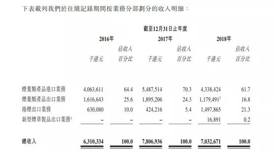 公司的主要营业收入来源为烟叶类产品进口业务,截至2018年底,该分部业务营收43.38亿港元,占总收入比例61.7%,其次为卷烟出口业务,截至2018年底,实现营业收入14.98亿港元,同比大幅增长253.3%,占总营收比例21.3%。