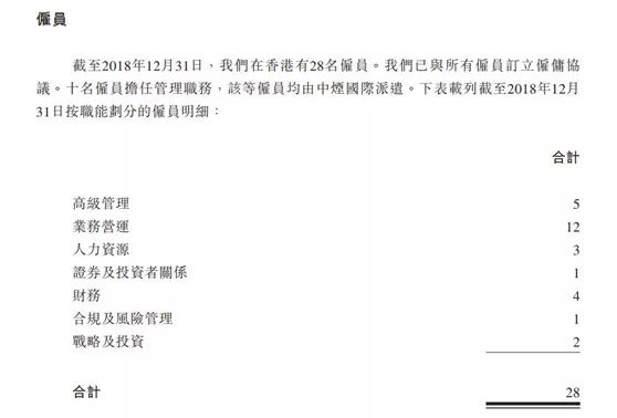 而就是这样一家公司,在香港仅有28名员工,其中高级管理人员5名,业务运营12名,人力资源3名,财务4名,战略级投资2名,合规及风险管理1名,证券及投资者关系1名。根据招股书显示中烟香港2018年度营业收入70.33亿港元,这就意味着每名员工创收逾2.5亿港元。