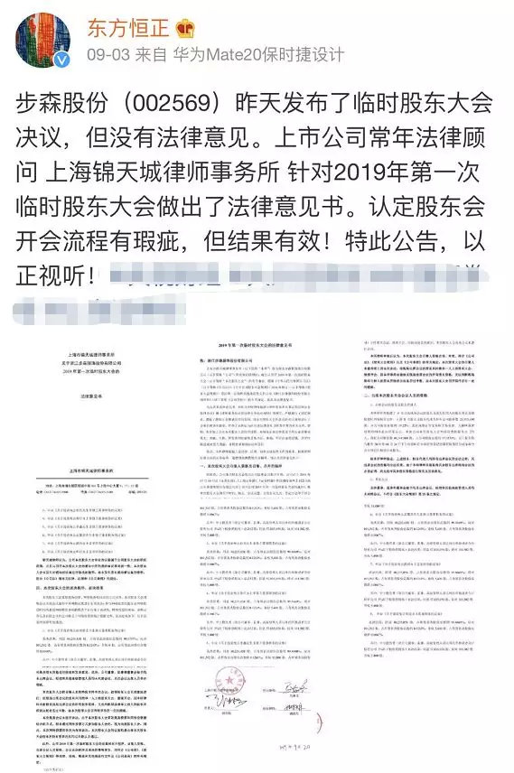 从今年5月成为*ST步森第一大股东以来,在关于股东资格、董事会改选提名等诸多事项的公告中,他们选择性发言。比如说,2019年8月5日,东方恒正向*ST步森股东大会提交《关于提名上市公司第五届董事会非独立董事的议案》和《关于提名上市公司第五届监事会非职工代表监事的议案》两项临时提案。但是,直到2019年8月15日,*ST步森才对上述临时提案进行披露。律师风云的背后*ST步森9月2日的股东大会上,原定的两位“见证律师”成为了这场闹剧的导火索。根据事后的监管问询函,两人将被浙江证监局“约谈”。