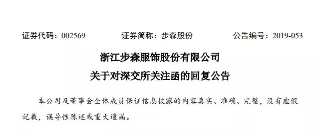 我们派出求证的同事,他家亲戚恰好是‘爱投资’受害者,所以托付我们同事去经侦部门了解情况,并得到了口头明确答复。”“爽约”证监局一年 遥控董事会选择性披露?今年9月,在一则深交所关注函的回复公告中,*ST步森指出,虽然董事长赵春霞因身体欠佳正在接受治疗,但迄今仍坚持通过电话会议等方式参加董事会及公司经营管理会议,亲自审批生产经营过程中需要董事审批的事项,正常履职,未对公司生产经营产生重大不利影响。