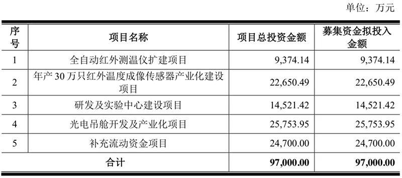 为解决产能瓶颈,7月1日,公司发布定增预案,拟募资不超过9.7亿元,投入全自动红外测温仪扩建、年产30万只红外温度成像传感器产业化建设项目等。