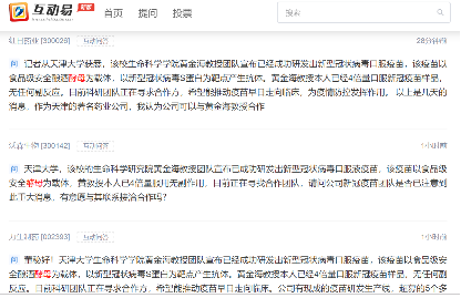 此外,红日药业、沃森生物、力生制药均有投资者在互动平台提问,是否愿意和黄金海教授接洽合作。