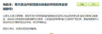 新京报报道中称,天津大学生命科学学院黄金海教授团队已经成功研发出新型冠状病毒口服疫苗,该疫苗以食品级安全酿酒酵母为载体,以新型冠状病毒S蛋白为靶点产生抗体。黄金海教授本人已经4倍量口服新冠疫苗样品,无任何副反应。目前科研团队正在寻求合作方,希望能推动疫苗早日走向临床,为疫情防控发挥作用。