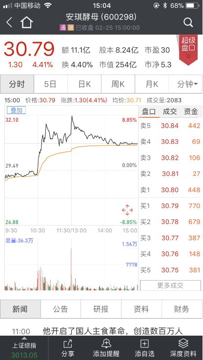 消息一出来,早盘低开的安琪酵母直线拉升,盘中最高涨幅达8.85%,最终股价收于30.79元/股,收盘涨幅达到4.41%,换手率4.4%。