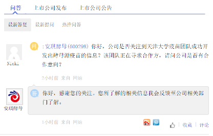在上证e互动上,有投资者提问,公司是否关注到天津大学疫苗团队成功开发出酵母源疫苗的信息?该团队正在寻求合作方,请问公司是否有合作意向?