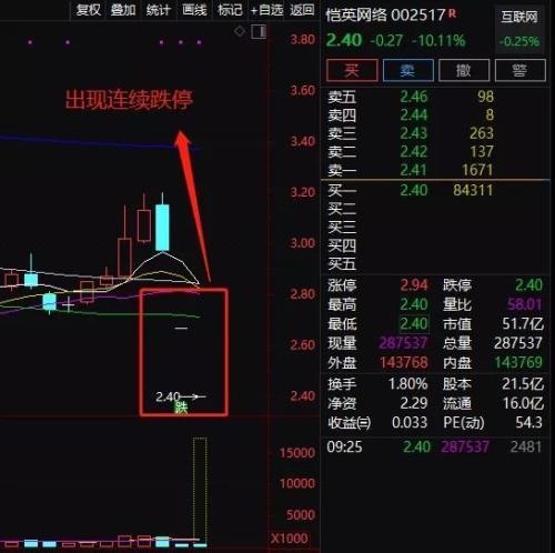 屋漏偏逢连夜雨!“最年轻富豪”实控人和董事长在内多名高管被抓或被调查之后,恺英网络控股子公司遭人索赔76.62亿元。昨日跌停之后,今日开盘恺英网络再度跌停,开盘报2.4元,以此计算总市值为51.6亿元。